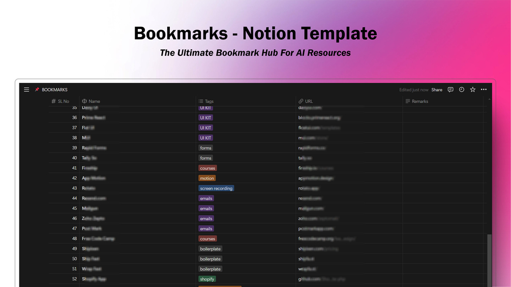 The Bookmarks Template is a cutting-edge Notion tool tailored for developers, leveraging the power of AI-driven resources and essential tools to streamline your workflow. Designed to manage and organize your digital assets, this template is perfect for storing links to AI tools, developer guides, tutorials, and other helpful resources.